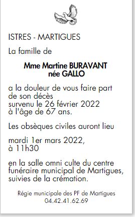 Décédée à Istres (13800, France) le samedi 26 février 2022 à l'âge de 67 ans