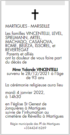 Décédée à Istres (13800, France) le mardi 28 décembre 2021 à l'âge de 93 ans