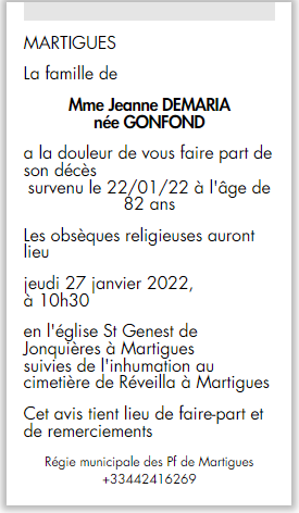 Décédée à Vitrolles (13127, France) le samedi 22 janvier 2022 à l'âge de 82 ans
